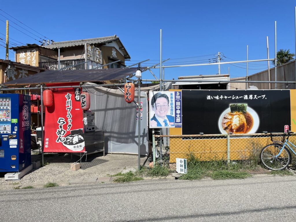 市川ブラックラーメンは、すぐ目の前は江戸川という立地にある「林遊船」という釣り船屋さんの4代目の方が店主のお店で、「林遊船」の駐車場に屋台を建て、キッチンカーでラーメンを作っているお店です。