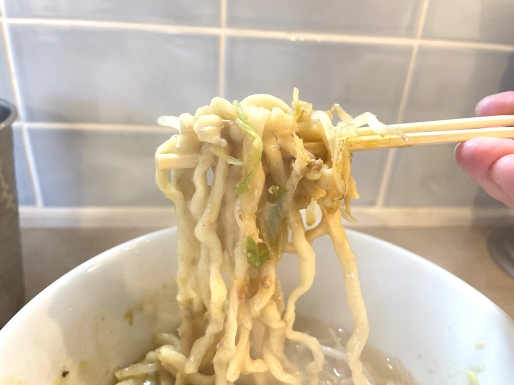 麺はハード寄りでありつつ、しっかりスープが絡む。濃厚系の味噌ラーメンでこういった麺を合わせているのも