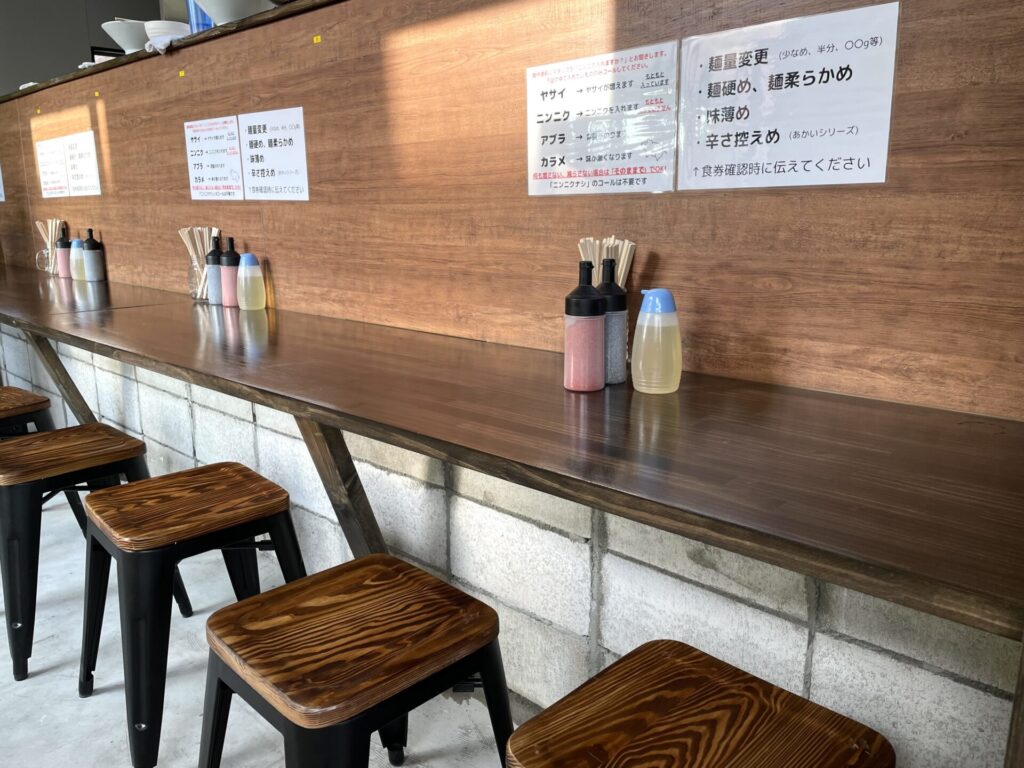店内待ちの並び方について、オープン初日なので、まだ変わるかもしれませんが、先頭組はカウンター席背後、次は給水機のあたりから、券売機のほうに向かって並ぶといった感じでした。座席へのご案内はロット毎にされているようで、お店の方の指示に従えば間違いないと思います。