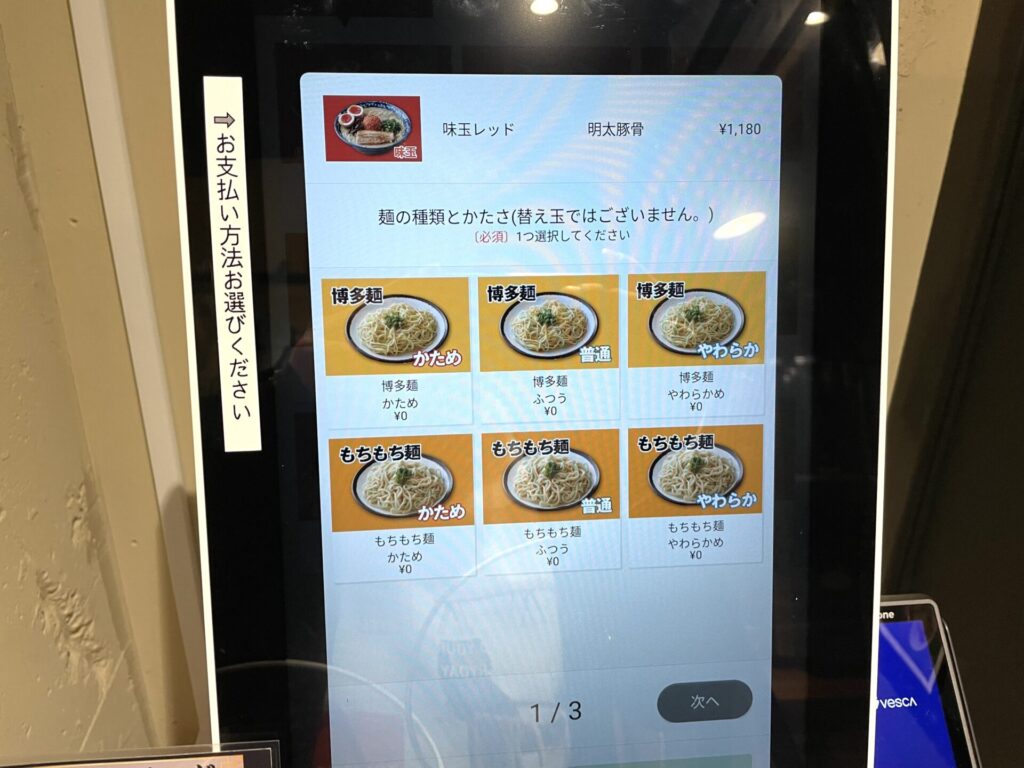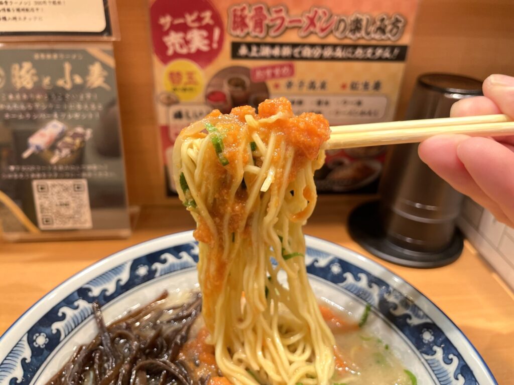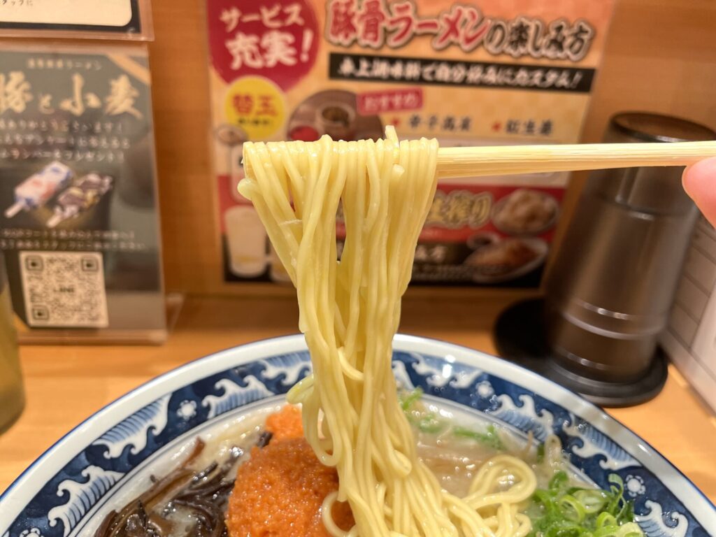 麺は、「博多麺」の固さ普通を選択。歯切れ良くソフトな印象です。