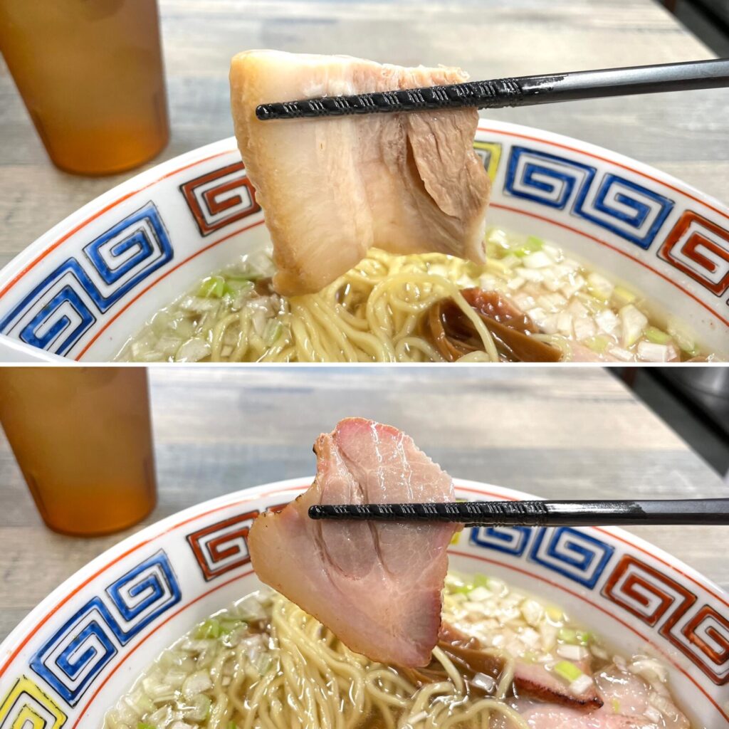かなり柔らかい豚バラチャーシューと、ジューシーで風味の良い吊るし焼きの肩ロースは、どちらも美味!