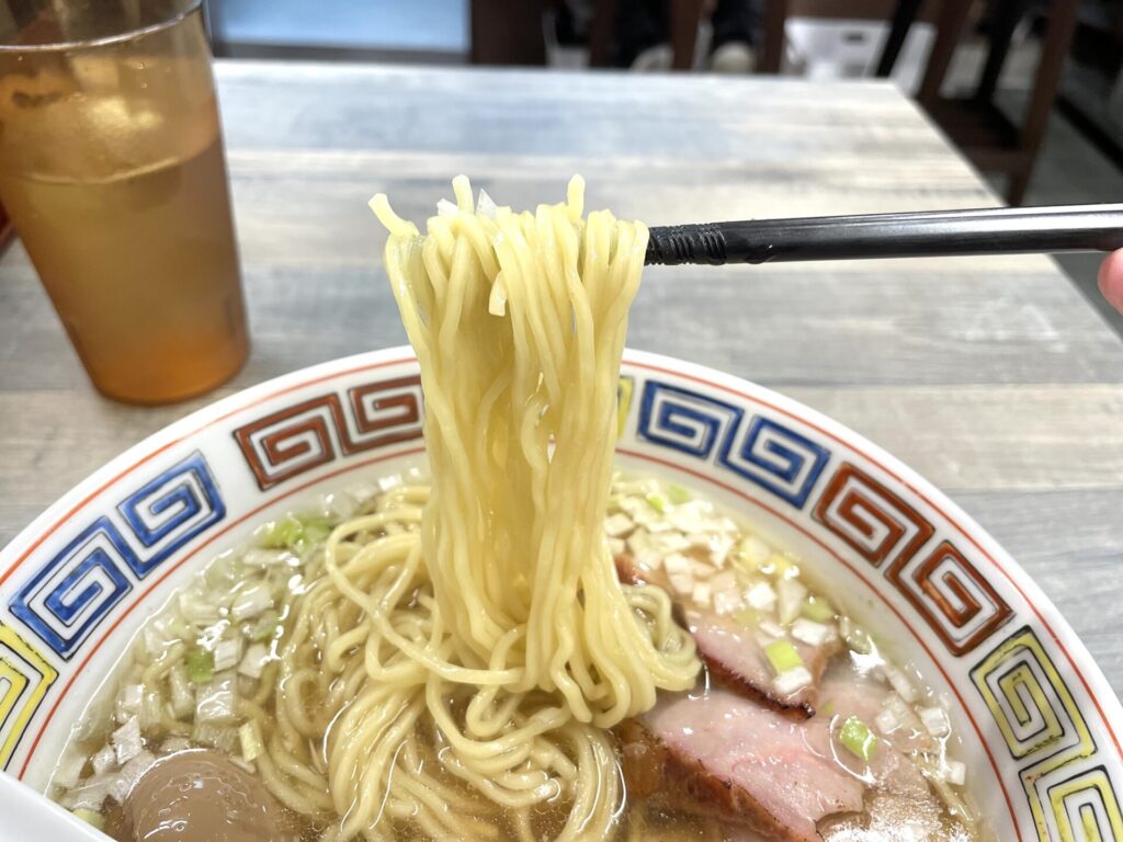 菅野製麺の中細くらいの麺は少し縮れ気味で、どこか「昔ながら」を感じさせるもの。