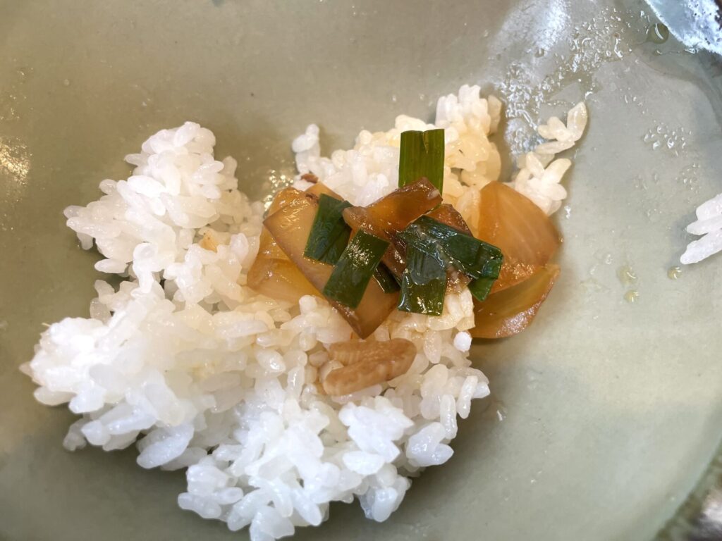 ライス(¥300)に玉ねぎやニンニク、ニラなどの具材を合わせる