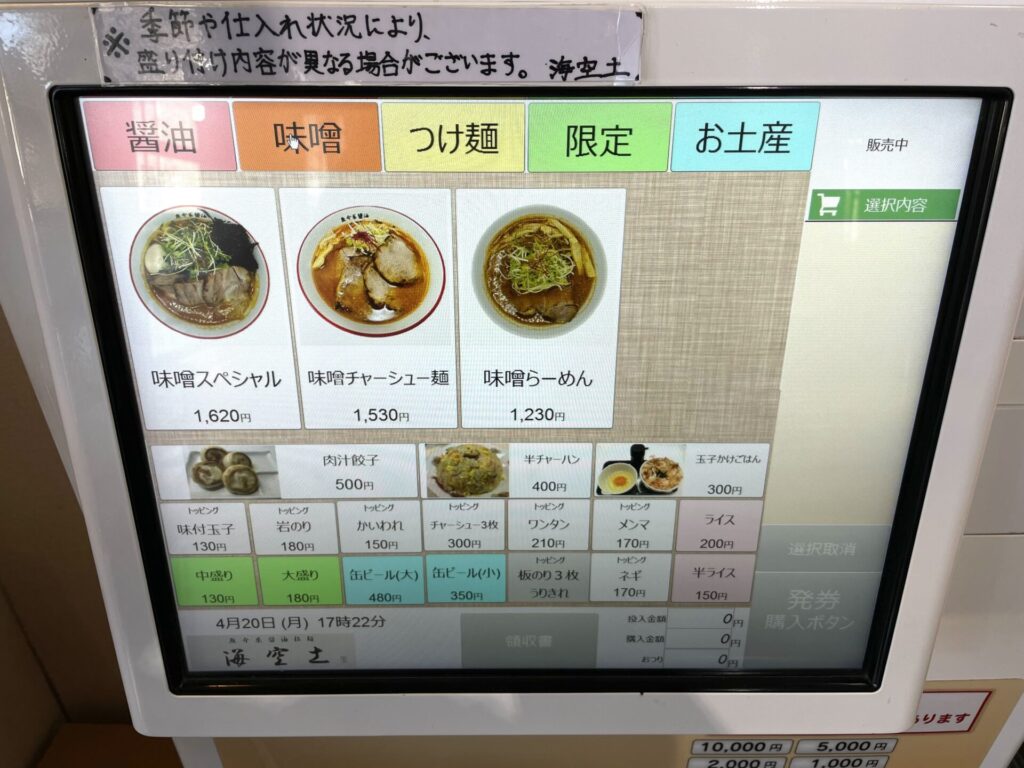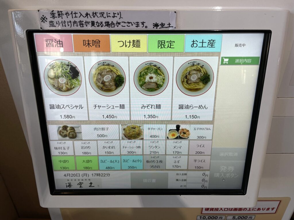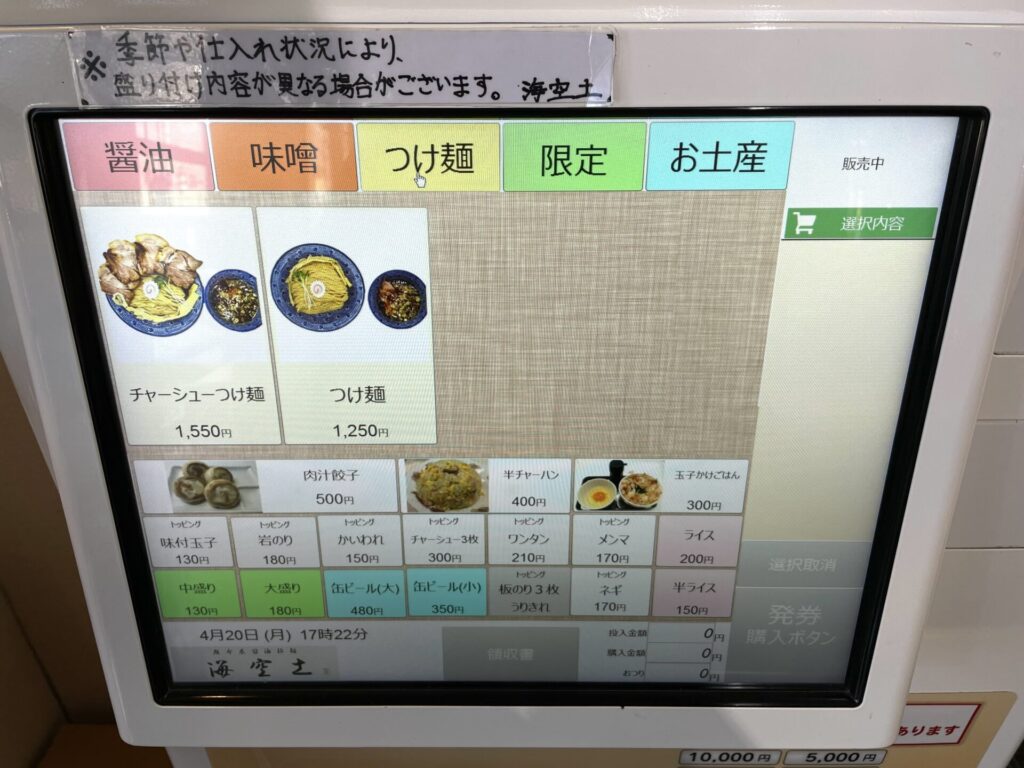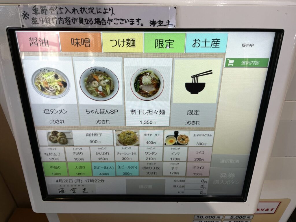 海空土は通し営業、緩やかな時間帯での訪問となり、食券を2枚購入させていただきました。
