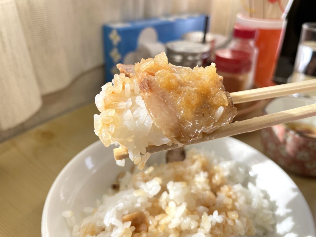 チャーシュー、おろし玉ねぎを巻いて、ライスと合わせる。この組み合わせは良い意味で危険と思うほど、ベストマッチで、ライスが一瞬で消えていくのを感じます。