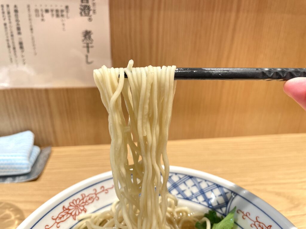 こちらは煮干しラーメンといえばの細パッツン麺で、やはりこのハードな歯応えは最高ですね。スープをよく引き連れてきてくれます。