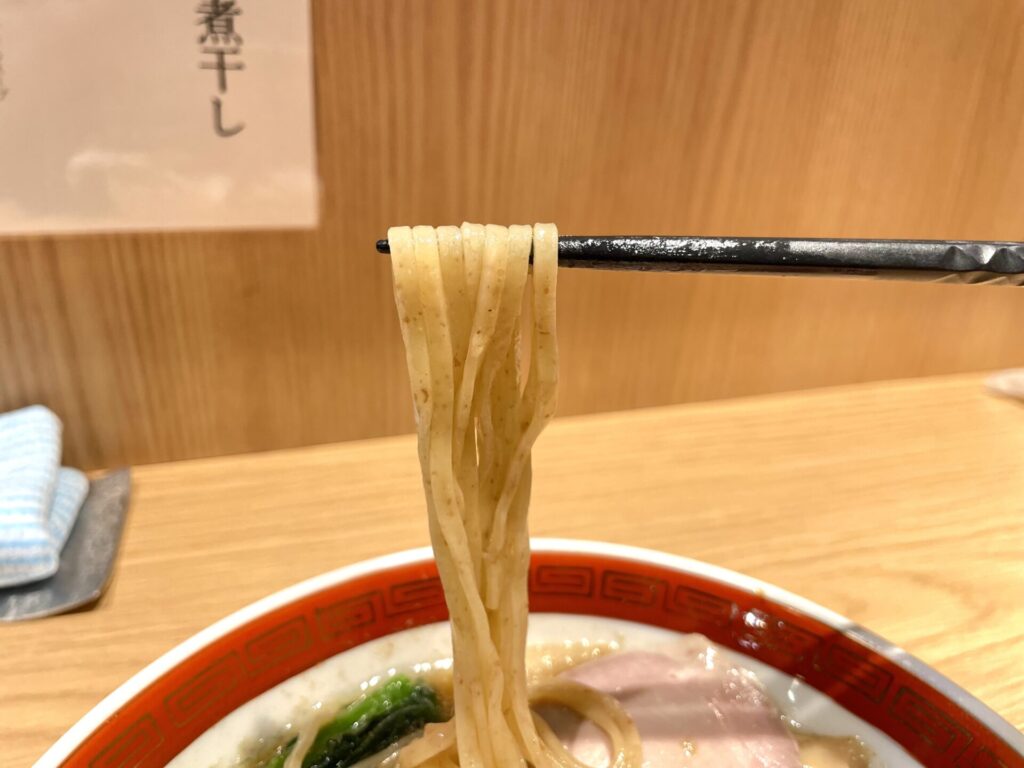 麺は、全粒粉入り中太ストレートで平打ちタイプで、スープの持ち上げが良く、滑らかな啜り心地が印象に残るものでした!