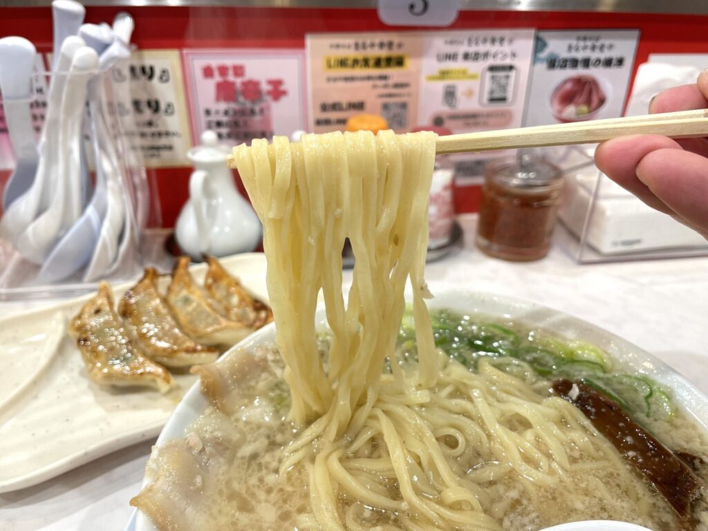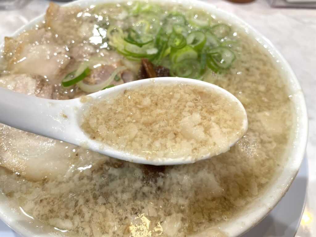 ところどころ塊のような背脂も入っているスープは、背脂の甘みがスープ全体をコーティングしている印象で、豚の旨味溢れるスープ!それでいてポピュラーな味わい!背脂の量の多いですが、飲めます。