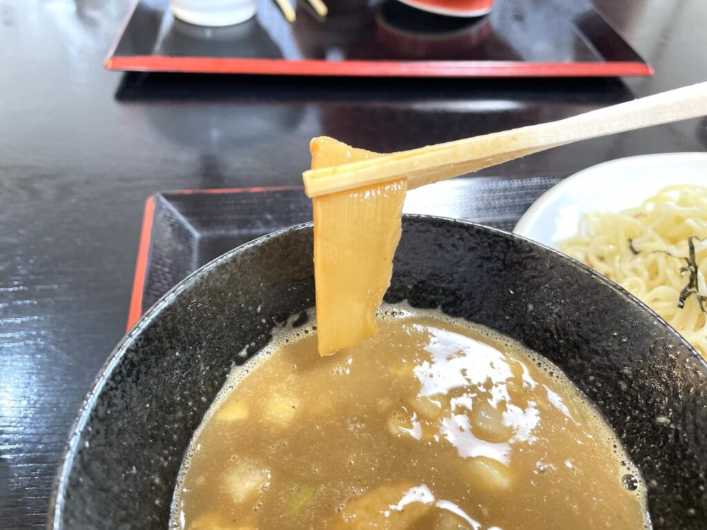 濃厚煮干しつけ麺も、エッジの効いた煮干しの味わいが「これだよこれ!」と言った感じで啜りが止まりませんでした。つけ麺の麺も啜っている最中に「いつかはなくなってしまうのか」と良い意味で切ない気持ちで箸を進めていました。