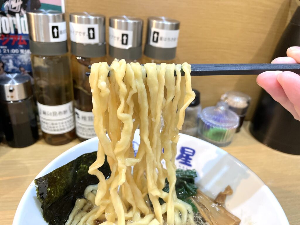 中細くらいの自家製麺は、もちっと感ありつつ滑らかでスープとも絡みもかなり良いです。