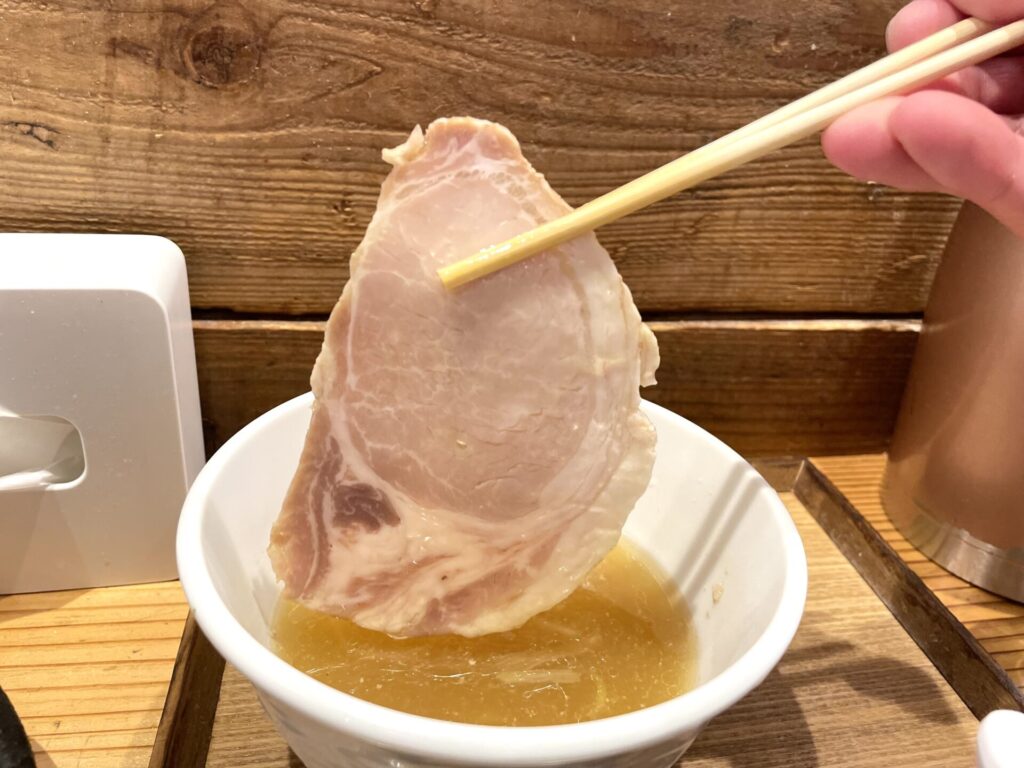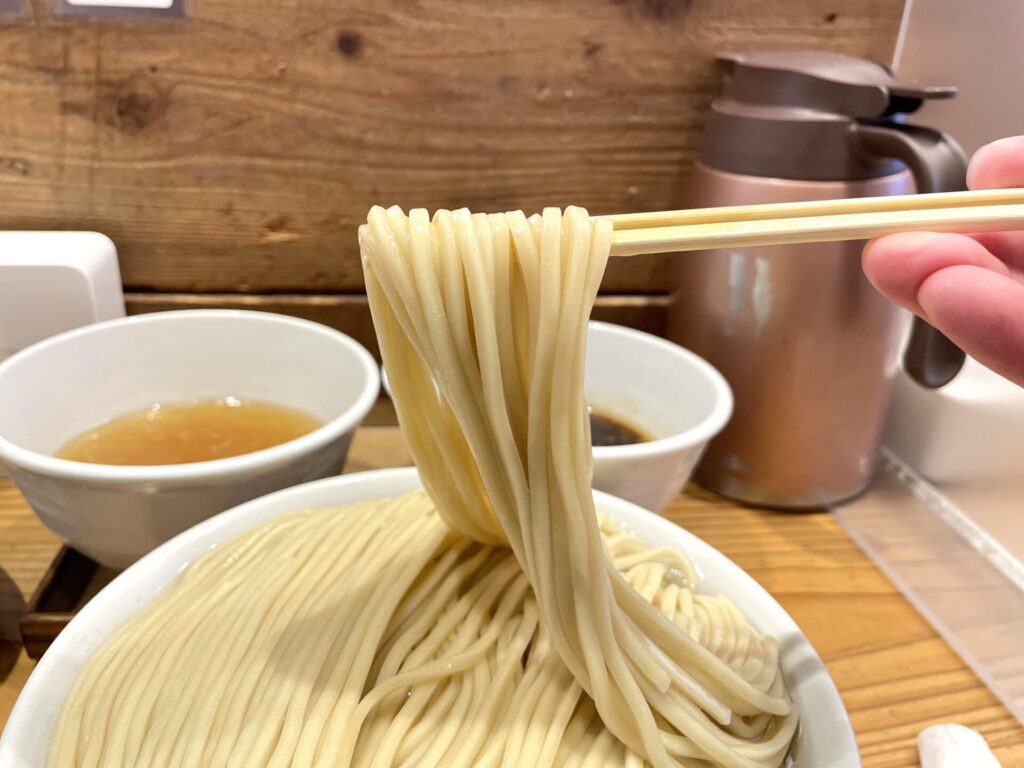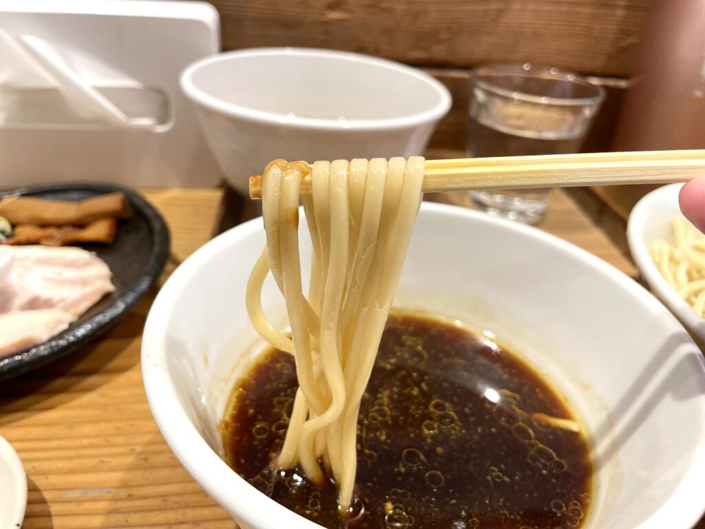 昆布水に浸かった「心の味食品」の麺はかなりハードですが、もっちりした感覚も共存しており、小麦感が濃密で噛むのに力を入れるイメージです。この麺だけでだいぶ箸が進んでしまう予想はあったので、麺600gにしたのですが、やはり200gはそのまま食べしまったくらい、麺だけでもめちゃ美味しいです。