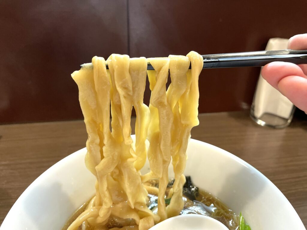 滑らかな舌触り、スープの持ち上げも確かな極太の「手揉み麺」