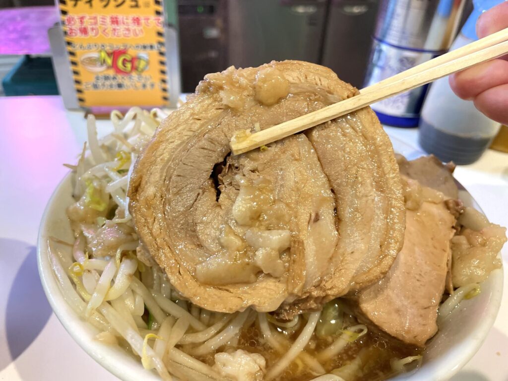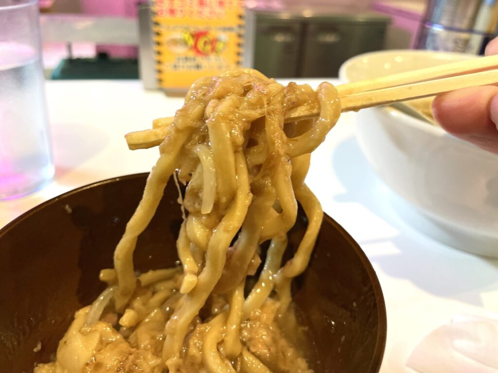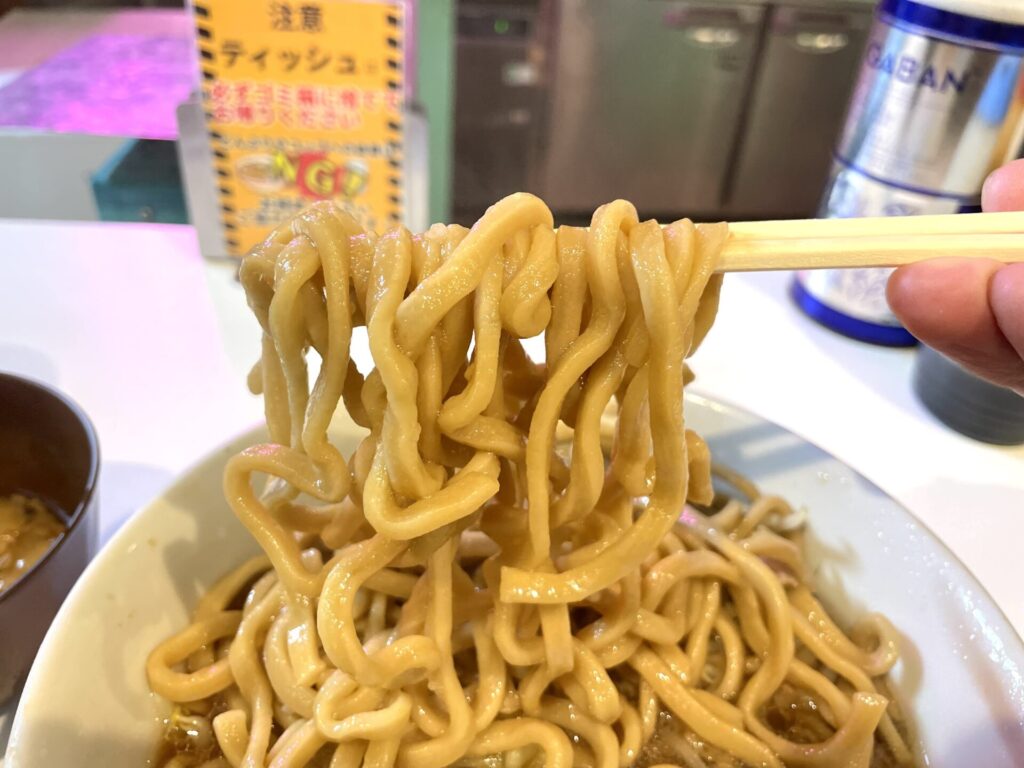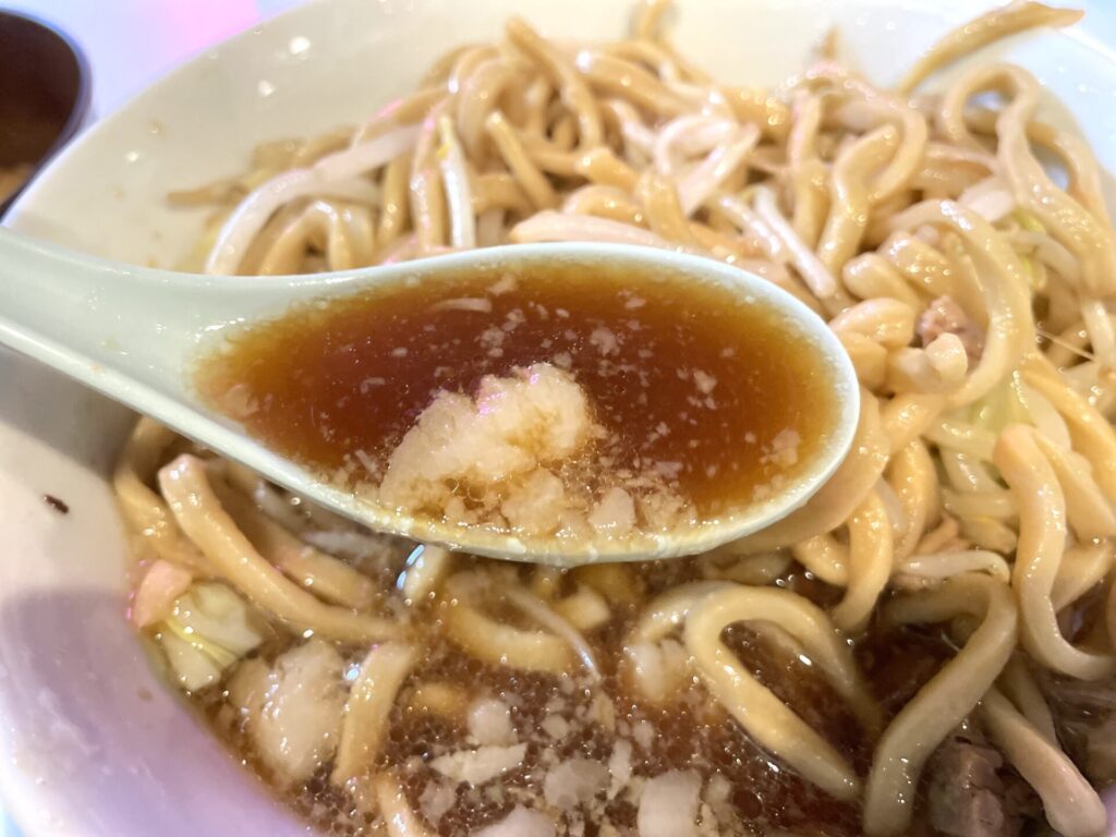 スープはまさにポン酢なのですが、さっぱり感ありつつ、液体アブラにより、しっかりとラーメン感を感じられるもの。これがまた二郎系らしさもあるところが絶妙です!