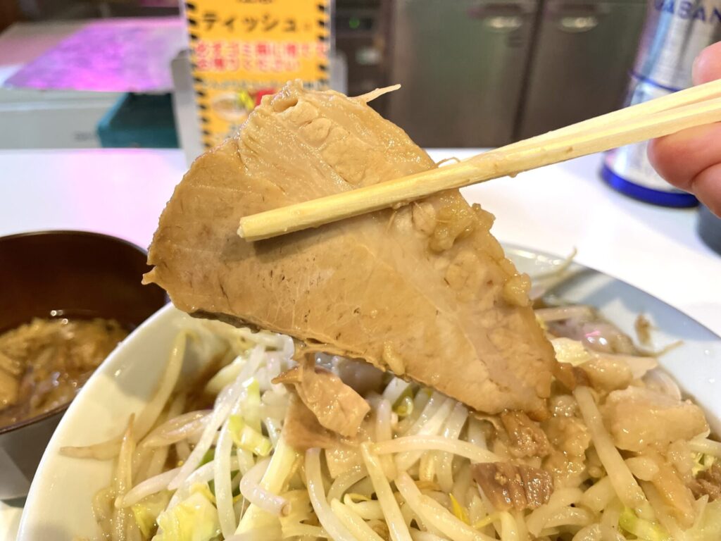 「煮豚1枚追加」によりヤサイに寄り掛かる巻き豚は、大ぶりで肉食ってる感ありつつソフト食感のもの。