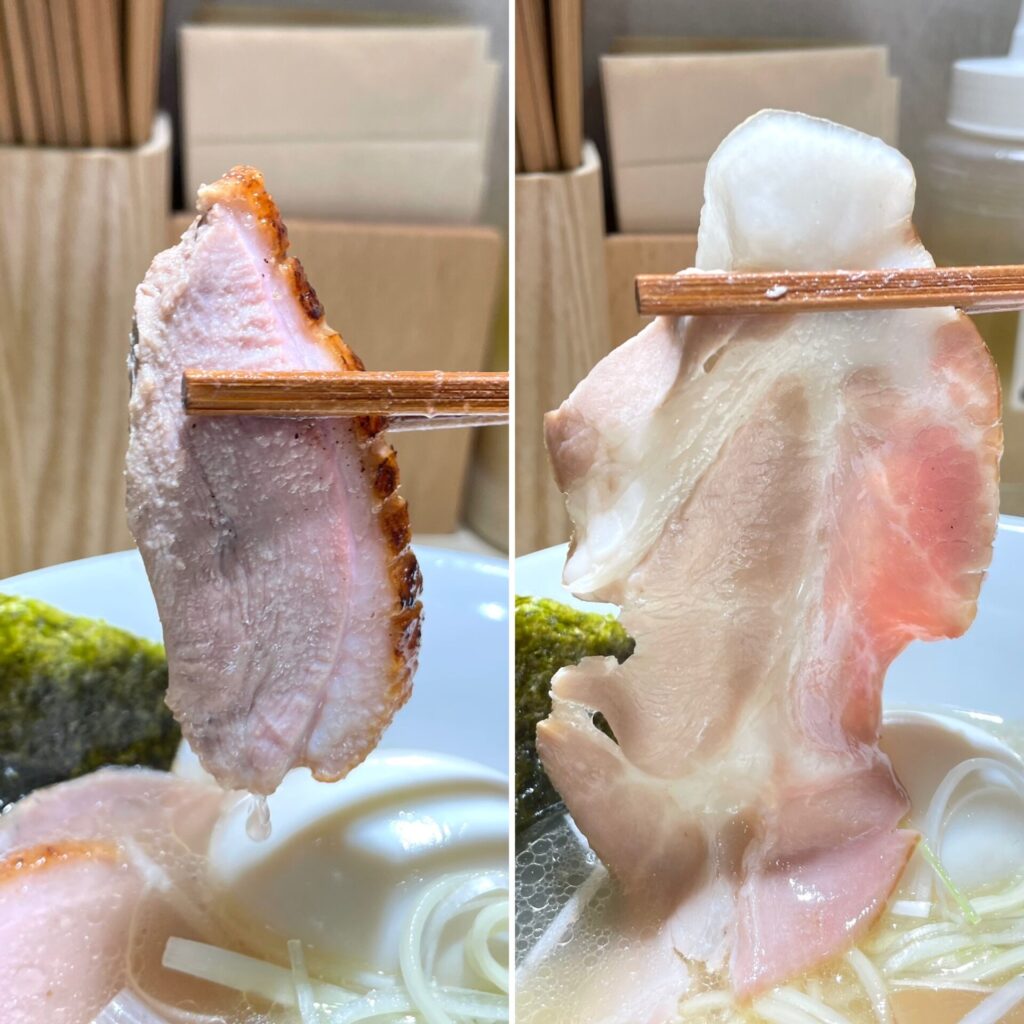 チャーシューは鴨が2枚、ロースが1枚なのですが、特にロース肉は、柔らかくて風味豊か!
