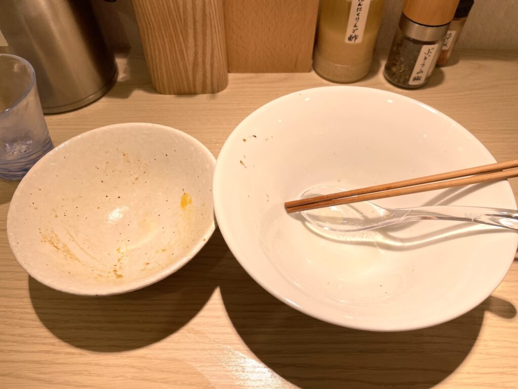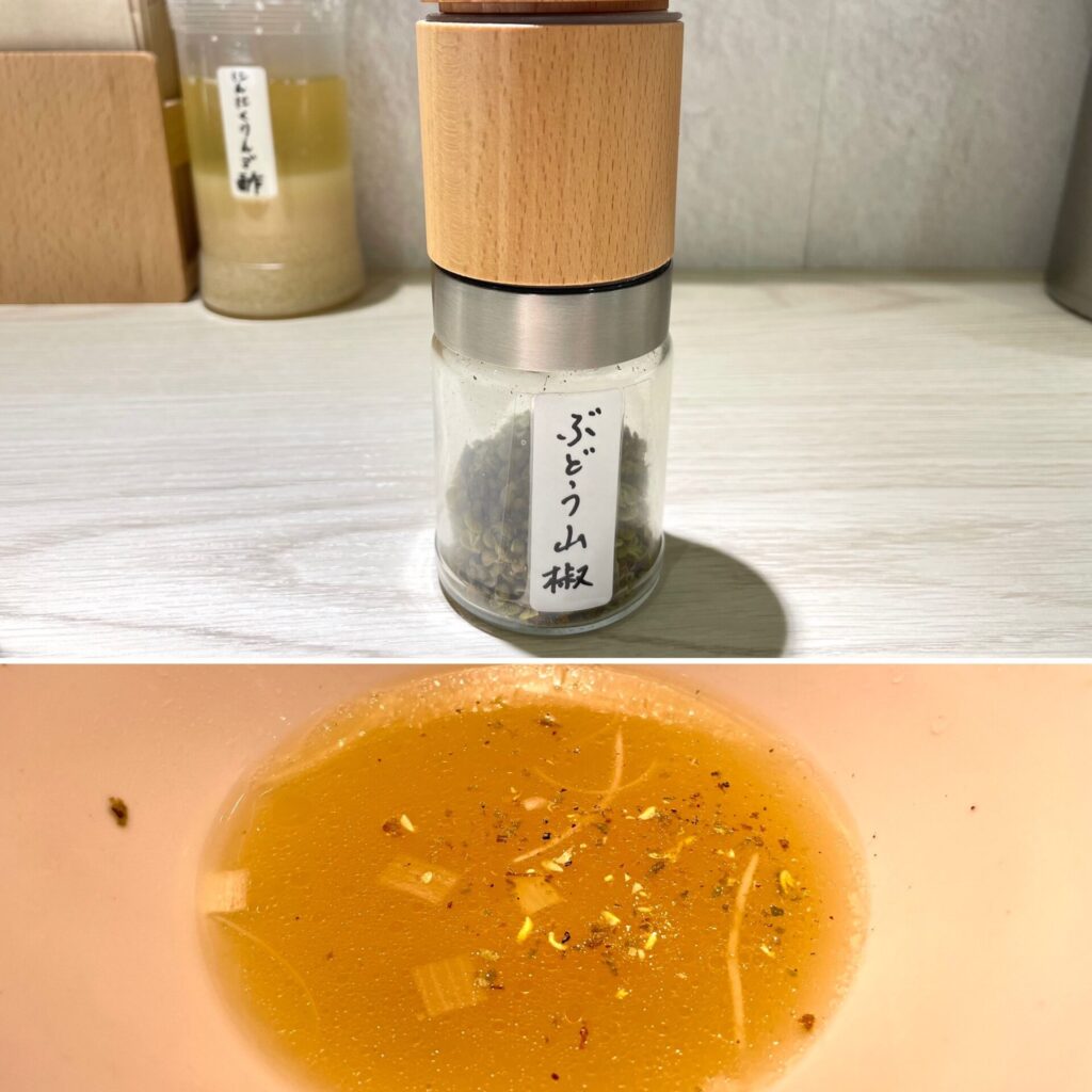 ふくよかな出汁感で、素材の良い部分だけを抽出したようなスープは、一口目から完飲を確定させるものでした。最後に使った「ぶどう山椒」も、個性的な味変アイテムで、山椒好きにはたまらないものだと思いました。