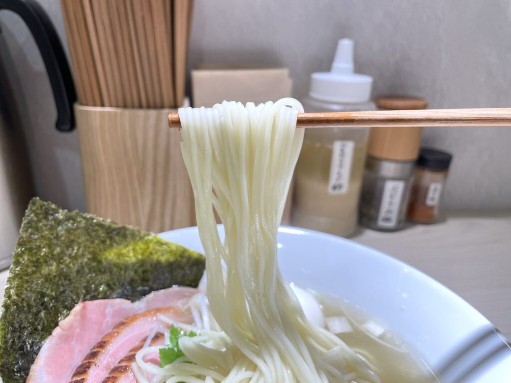 麺は、シルキーで麺線もバッチリ整えられています。ソフト食感のもっちりタイプでスープの持ち上げも良いので、唇の通過がたまらなく心地良いです。