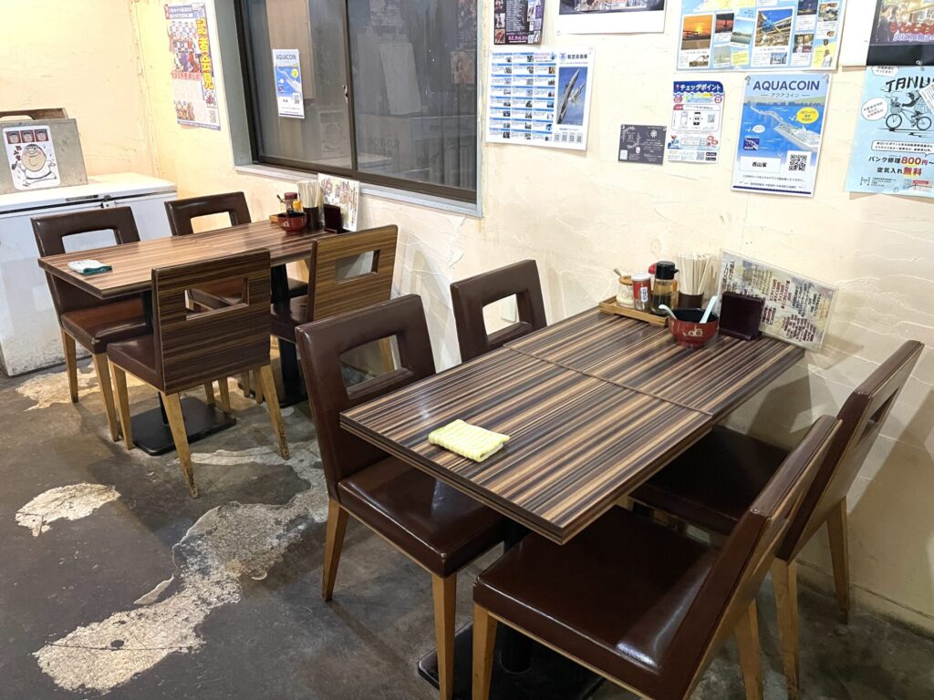 座席は、カウンター席、テーブル席、奥に小上がり席があります。