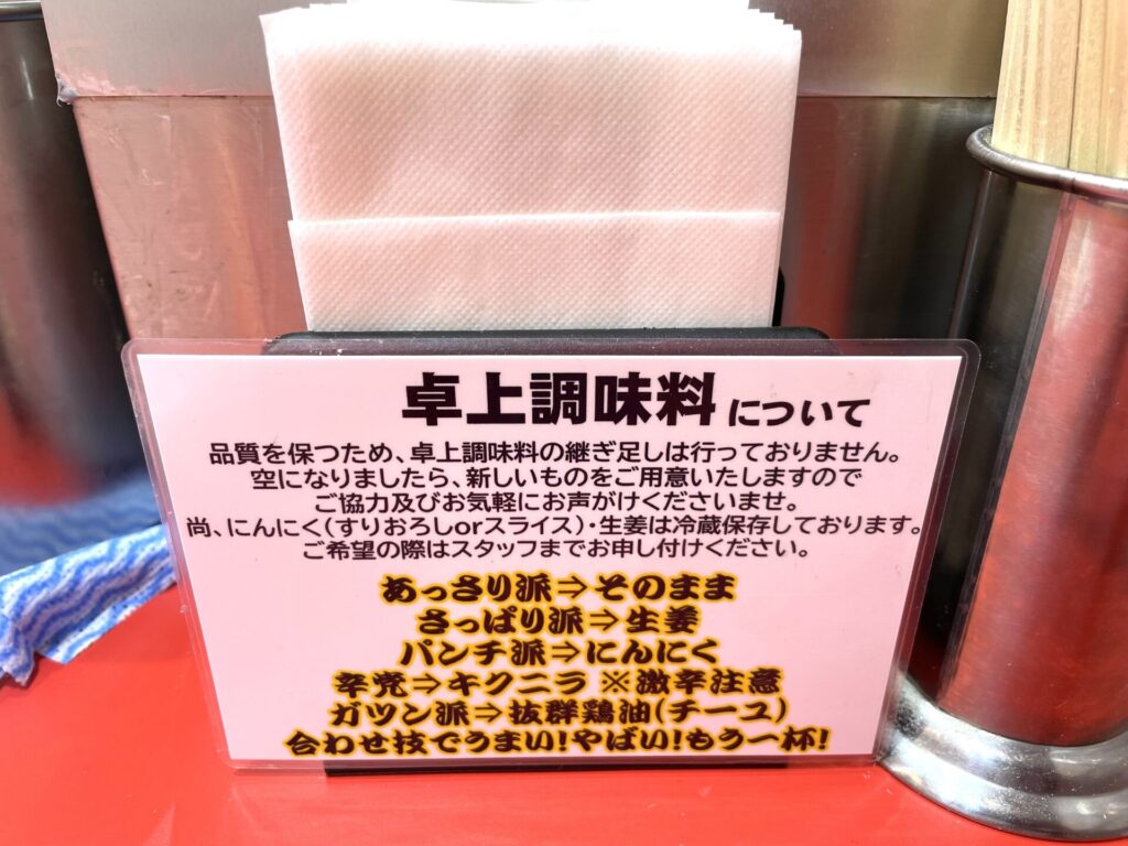 券売機左上の表示にあるように、白いプレート(今回は写真に映すのを失念…券売機下部にあります)も食券と一緒に出すと、半ライス1杯無料という、大感謝のサービスもあります。