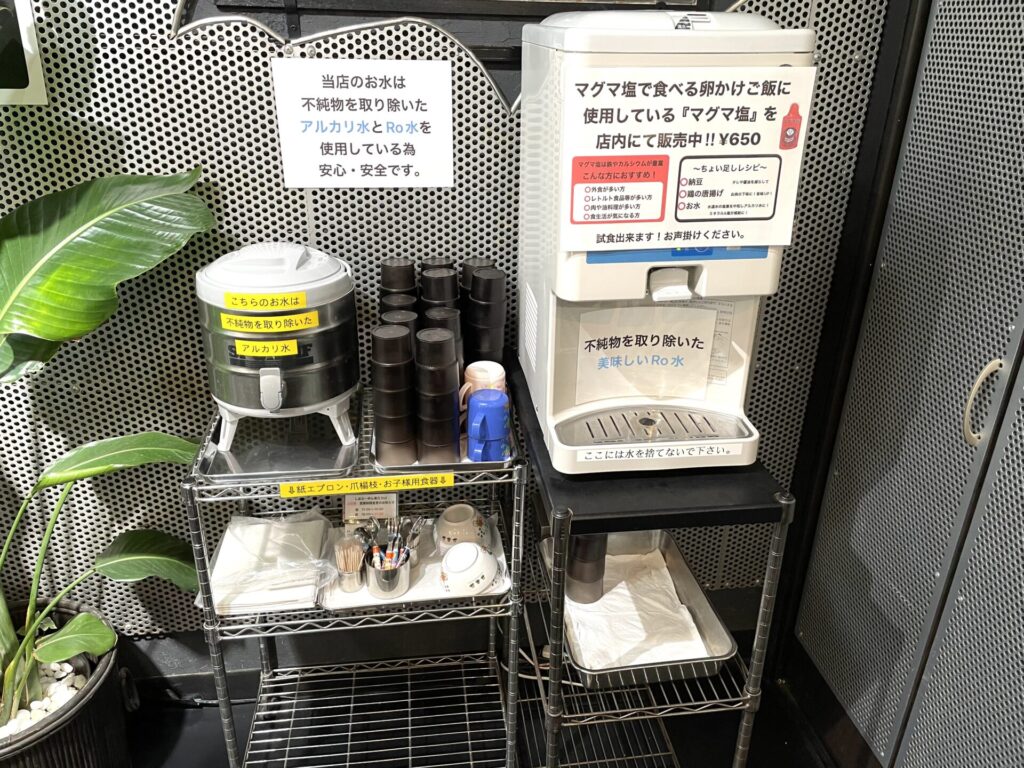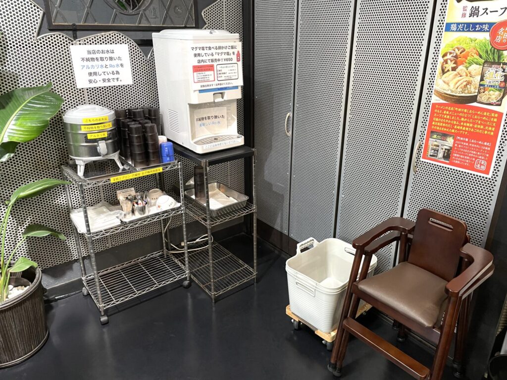お冷はセルフサービス、お子様用の椅子や荷物カゴもある