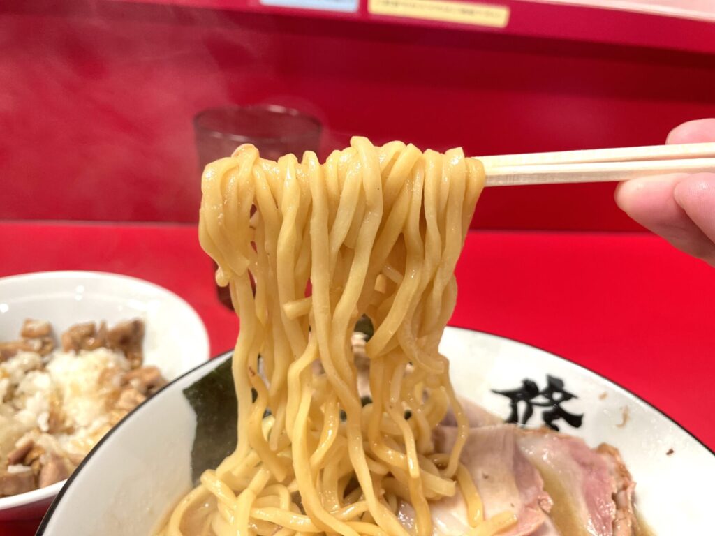 一口目で口内で融合される鶏油と豚感溢れるスープに、脳内のボルテージはいきなり最高潮!